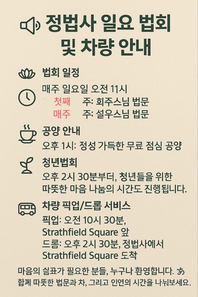| 시드니 정법사 sbs Australia 뉴스소식 | 공지사항[일반] | 23/10/2025 | 327 |