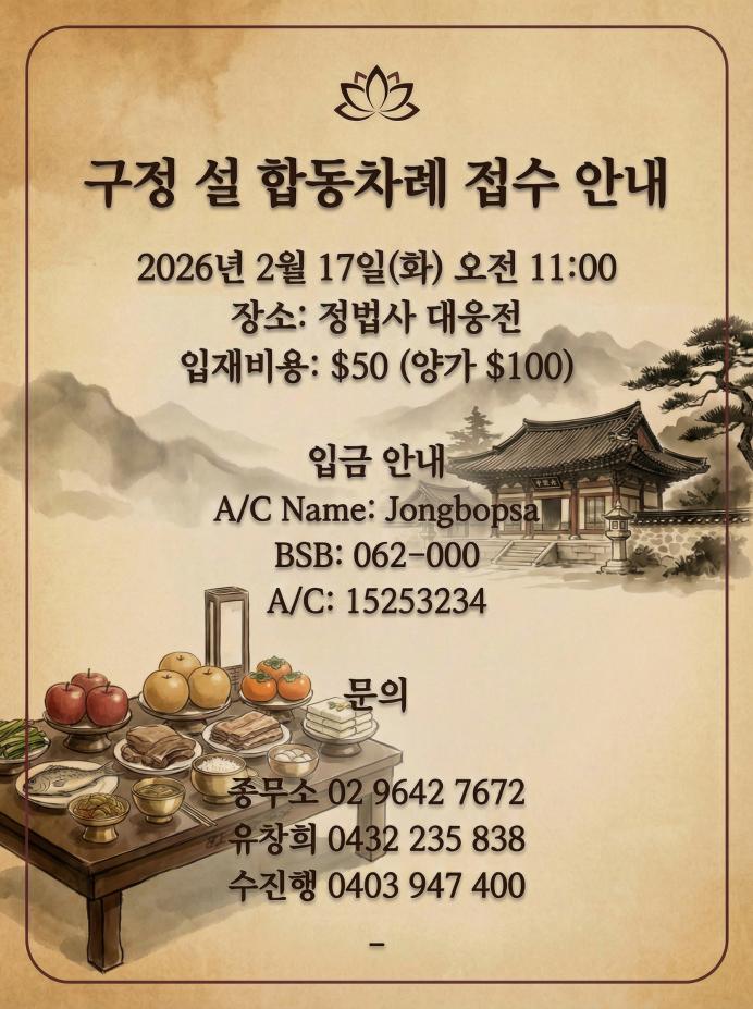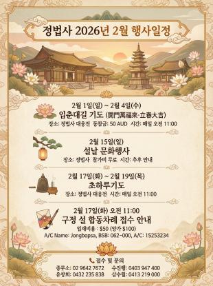구정 설 합동차례 접수 공지사항민족 최대의 명절 설날을 맞아 시드니 정법사에서 구정 설 합동차례를 봉행합니다.가정에서 차례를 지내기 어려우신 분들을 위해 정성을 다해 제수를 ...