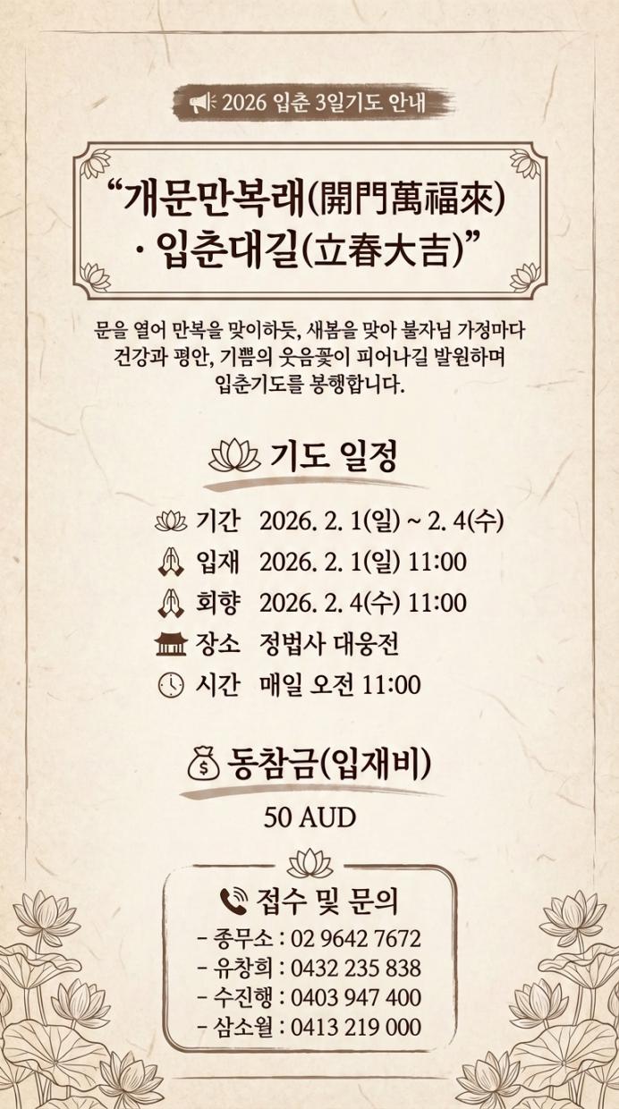📢 2026 입춘 3일기도 안내“개문만복래(開門萬福來) · 입춘대길(立春大吉)”문을 열어 만복을 맞이하듯, 새봄을 맞아 불자님 ...