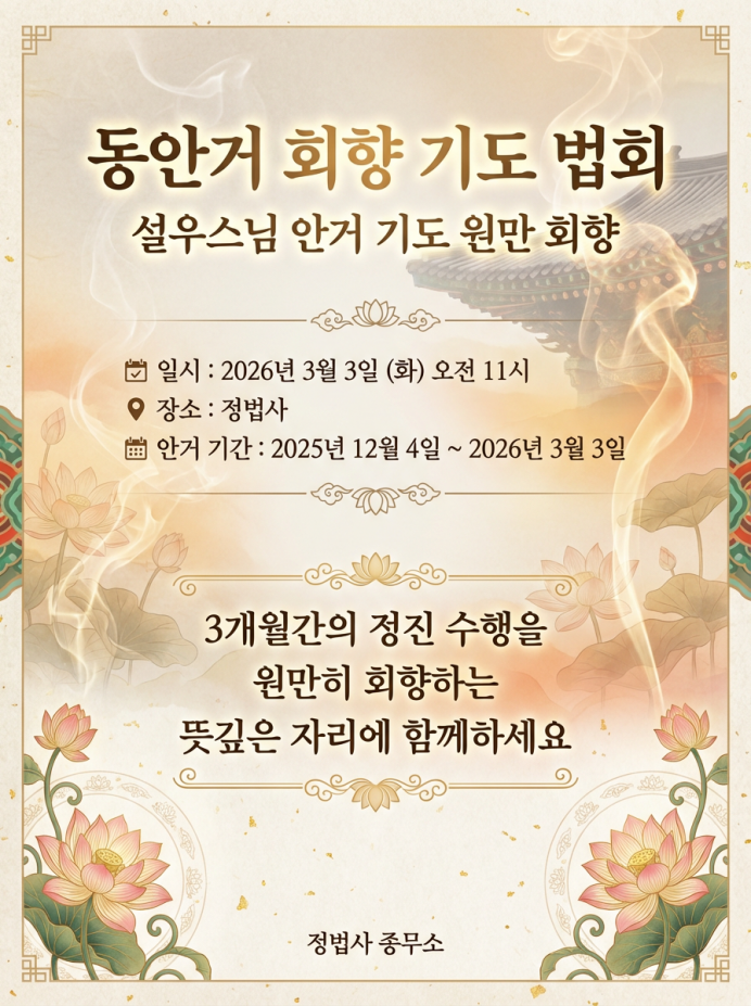 📿 동안거 회향 기도 법회 공지📿 동안거 회향 기도 법회 공지정법사 신도 여러분께 안녕하십니까.합장 🙏지난 2025년 12월 4일부터 3개월간 호주의 더위 ...