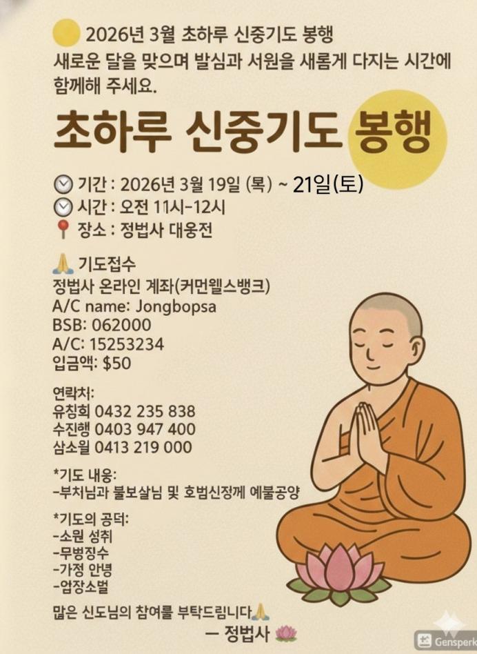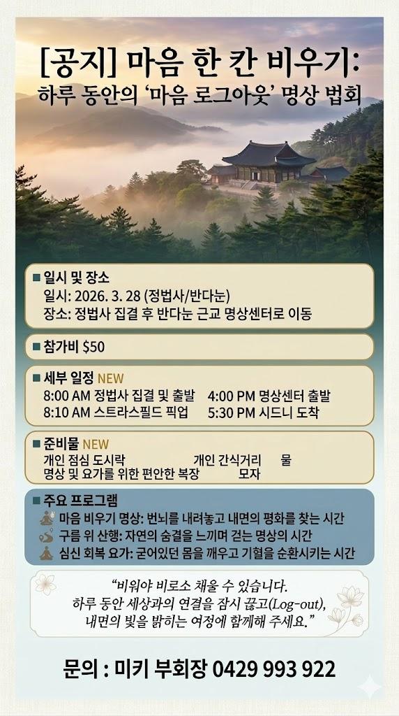 [공지] 마음 한 칸 비우기: ‘마음 로그아웃’ 명상 법회일상의 짐을 잠시 내려놓고, 산사의 맑은 공기 속에서 나를 만나는 시간을 마련했습니다.일시: 2026년 3월 ...