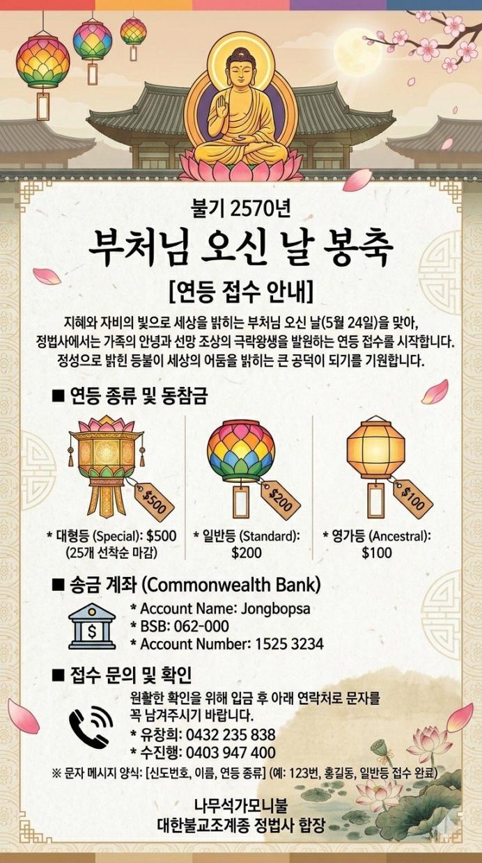 [공지] 2026년 4월 정법사 신중기도 및 천도재/기제사 일정 안내나무아미타불 관세음보살.희망찬 4월을 맞아 시드니 정법사에서 봉행되는 주요 법회와 기도 일정을 안내드립니다...