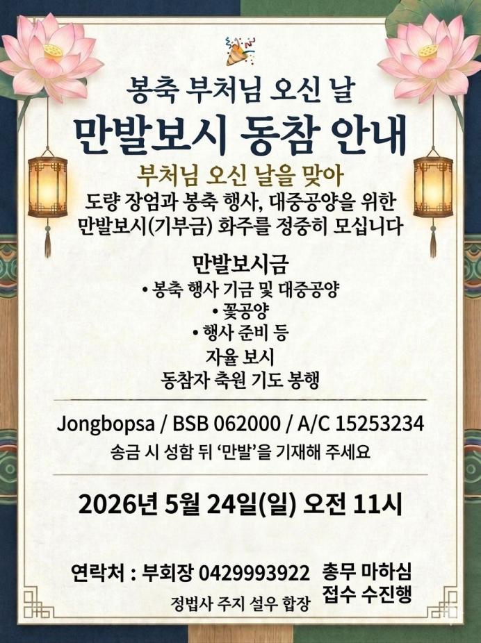 부처님오시날 만발보시 동참 안내“한 분의 지극한 정성이만 사람의 행복과 자비의 인연이 됩니다.”부처님 오신 날을 봉축하며,도량을 장엄하고 사찰을 찾는 모든 인연 대중과...