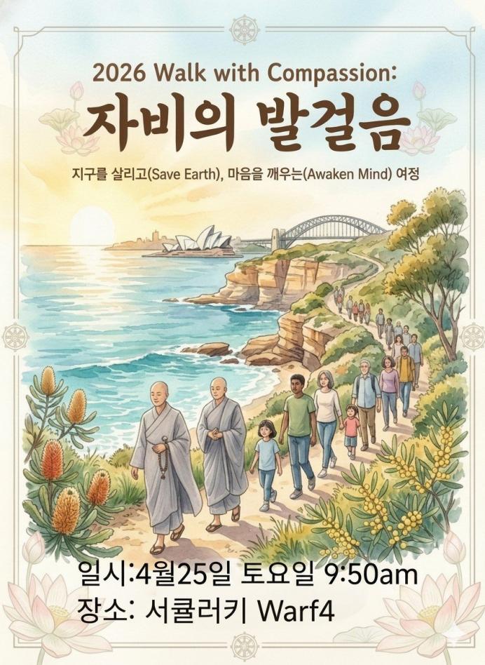 2026 4월 Walk with Compassion: 자비의 발걸음"지구를 살리고(Save Earth), 마음을 깨우는(Awaken Mind) 여정에 초대합니다."걷기 수행...